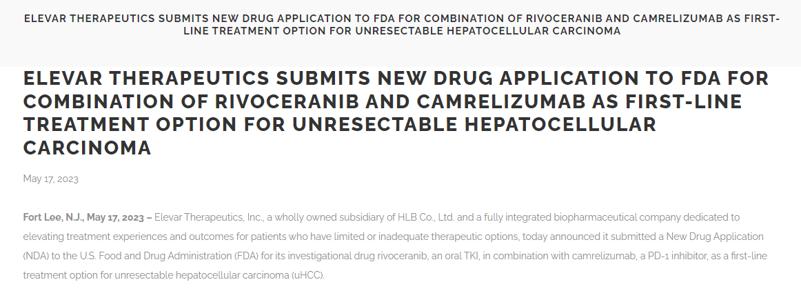 5 月 17 日,Elevar Therapeutics 宣布,已向 FDA 递交 PD-1 卡瑞利珠单抗联合阿帕替尼一线治疗肝细胞癌的新药上市申请(BLA)。