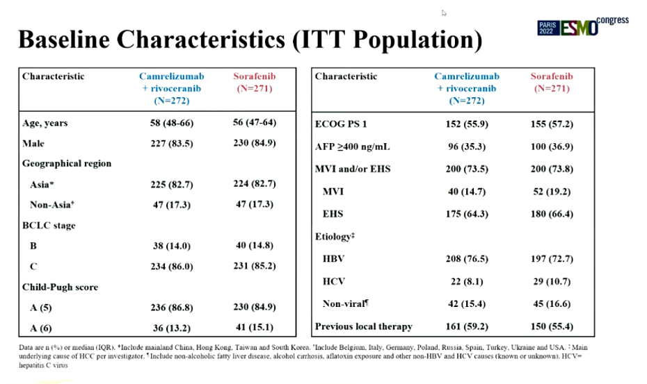 研究共纳入 543 例受试者,亚洲人占比近 83%,非亚洲人群占 17.3%;BCLC C 占比 86%,PS=1 占比 56%,HBV 病因学占比 76.5%,局部治疗占比 59.2%。