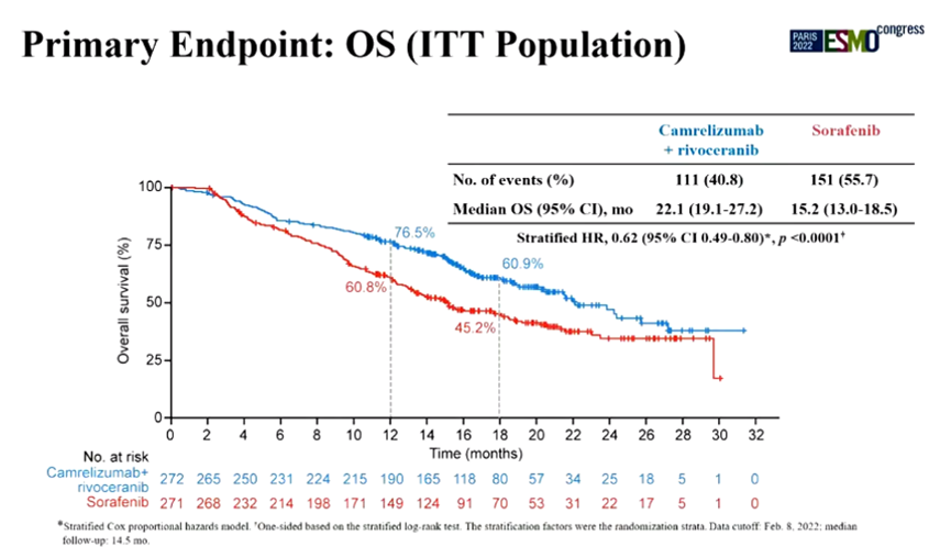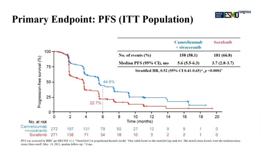 恒瑞的「双艾组合」本次在美国递交上市申请,是基于 III 期临床试验 SHR-1210-III-310(登记号:NCT03764293),其结果在去年 ESMO 年会上作为 LBA 报告发布。这是一项由肝癌著名专家秦叔逵作为全球 leading PI 的随机、开放标签、国际多中心 III 期研究,对比索拉非尼,主要终点为 IRC 评估的 PFS 和 OS,关键次要终点为 ORR。