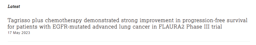5 月 17 日,阿斯利康宣布,III 期临床试验 FLAURA2 获得了高水平阳性结果,奥希替尼(Tagrisso,泰瑞沙®)联合化疗相较于奥希替尼单药一线治疗局部晚期(IIIB-IIIC 期)或转移性(IV 期)EGFR 突变 NSCLC 中表现出具有统计学显著性和临床意义的 PFS 改善。
