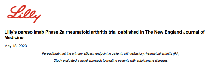 5 月 18 日,礼来宣布其 PD-1 激动剂 peresolimab 治疗类风湿关节炎(RA)的 2a 期临床试验结果发布在 NEJM。这是 PD-1 激动剂治疗自免疾病的首个临床证据。