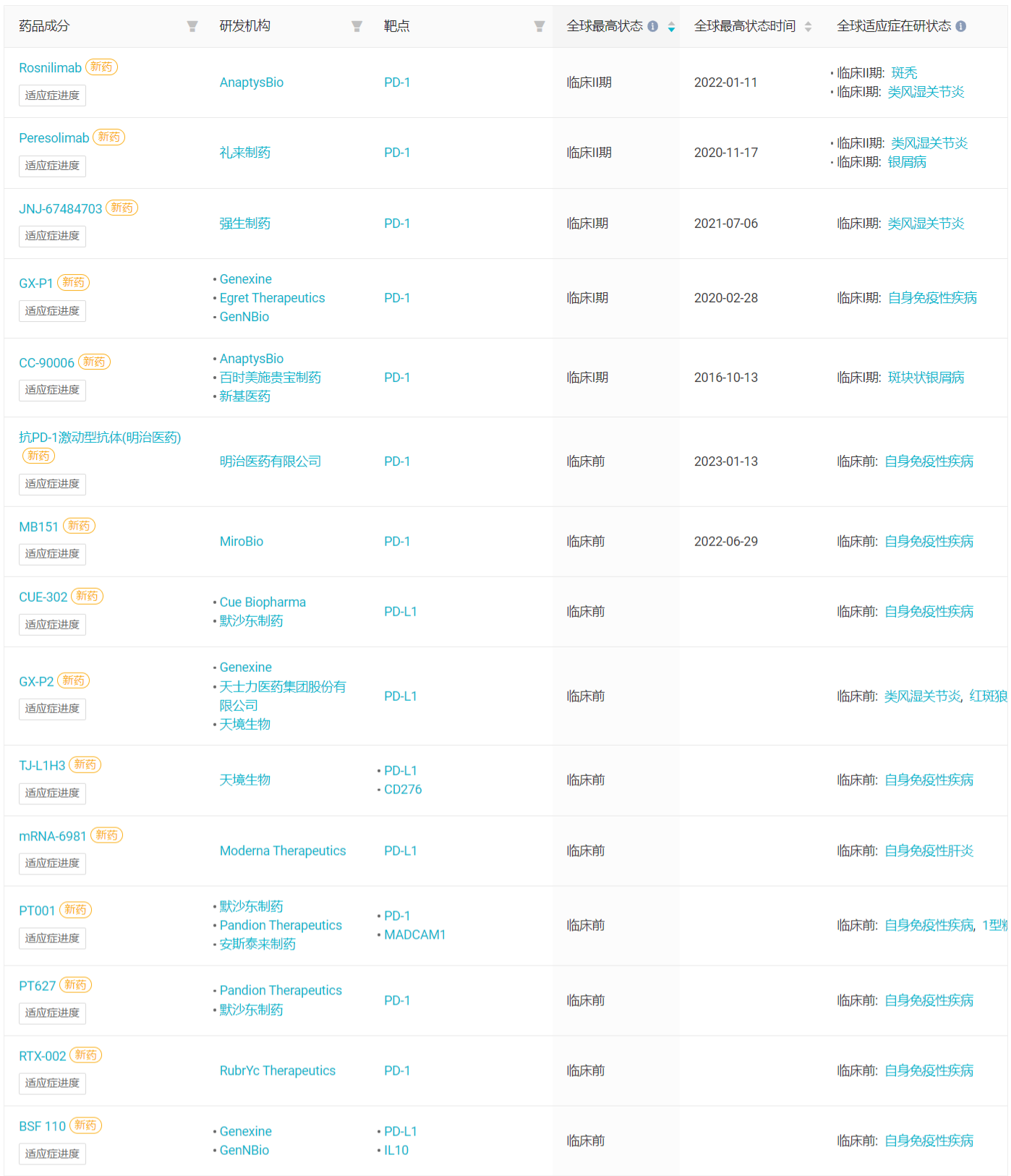 在 PD-1 为首的免疫检查点抑制剂们在肿瘤领域卷生卷死的同时,药企也在开发相应靶点的激动剂类药物,用于治疗自身免疫疾病。据 Insight 数据库显示,当前已有 15 个 PD-(L)1 项目被开发用于自免,而其中 5 个项目已启动临床试验,礼来是当中魁首。