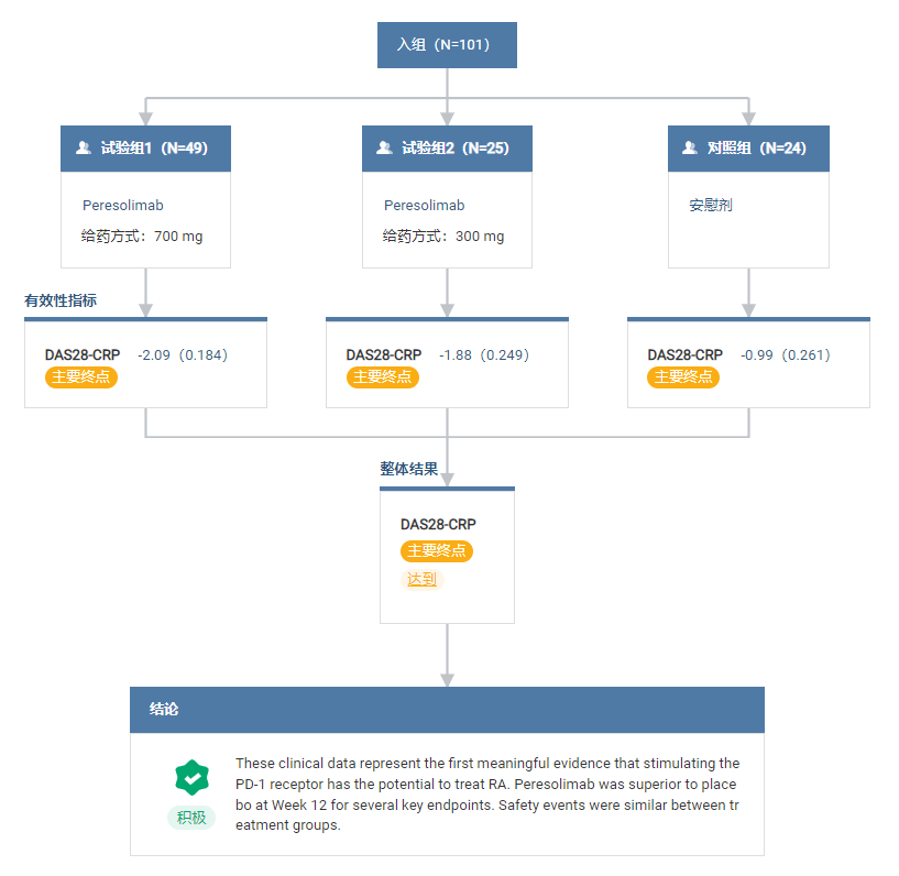 试验主要终点为基于 C 反应蛋白水平的 28 个关节疾病活动评分(DAS28-CRP)从基线至第 12 周的变化,主要比较 700 mg 组与安慰剂组之间的差异;次要终点则包括较基线实现 20%、50%、70% 缓解(即 ACR20、50、70)的患者比例等指标。