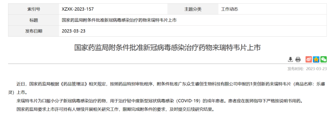 2023年3月23日,国家药监局附条件批准众生睿创生物(众生药业子公司)申报的1类创新药来瑞特韦片(商品名称:乐睿灵)上市,用于治疗轻中度新型冠状病毒感染(COVID-19)的成年患者。