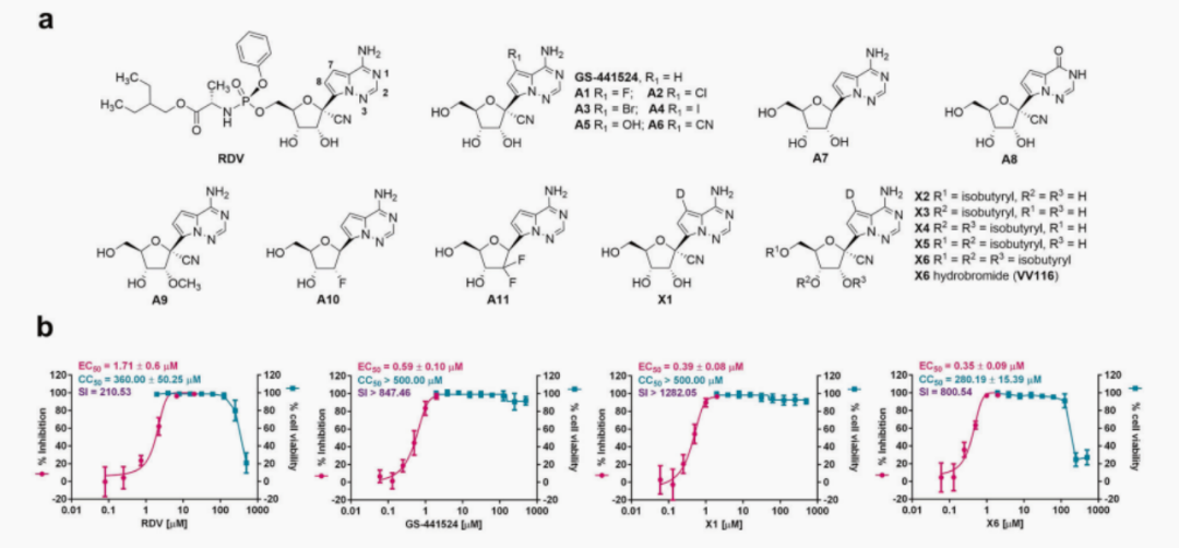 民得维(氢溴酸氘瑞米德韦片,VV116)是一款我国自主研发的口服核苷类抗病毒药物,可抑制SARS-CoV-2复制,原理是通过靶向RNA依赖的RNA聚合酶(RdRp)抑制病毒RNA合成。VV116设计灵感来自于瑞德西韦,在上海药物所的沈敬山科研团队在去年8月发表了VV116的合成论文,介绍了通过设计合成GS-441524类似物的一系列具有广谱抑制新冠病毒的化合物,其中就包括巧妙规避了吉利德专利的氘化核苷药物VV116。