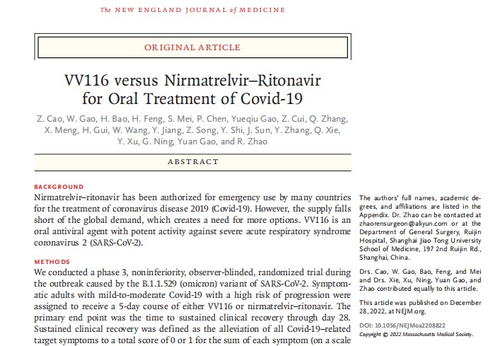 2022年12月28日,国际顶级期刊《新英格兰医学杂志》(The New England Journal of Medicine,NEJM)刊登了VV116与奈玛特韦片/利托那韦片(Paxlovid)口服治疗新冠感染患者的头对头比较III期临床研究(NCT05341609)结果,引起了业内轰动。这是NEJM发表的首个中国自主研发的新冠创新药物临床试验数据,具有非常重要的意义,虽然业内对该试验的设计和对照药临床终点等有着一定的争议,但是不可否认的是该药在国际上已经获得了相当程度的认可。