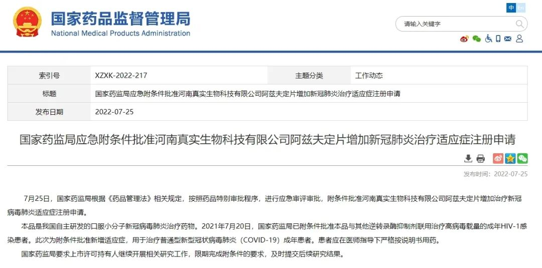 2022年7月25日,国家药监局根据《药品管理法》相关规定,按照药品特别审批程序,进行应急审评审批,附条件批准河南真实生物科技有限公司阿兹夫定片增加治疗新冠病毒肺炎适应症注册申请。