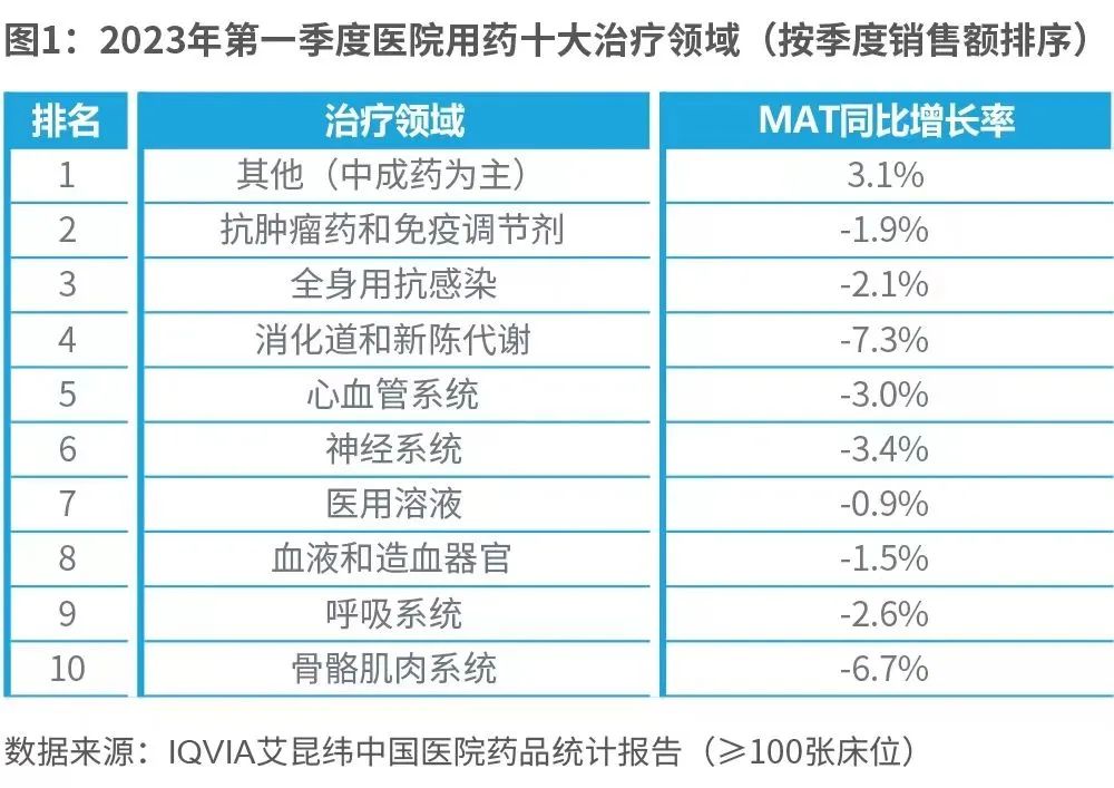 2023年第一季度中国医院医药市场有所复苏,同比增速恢复正向增长,总销售额*季度同比增长率为1.8%(数据来源:IQVIA艾昆纬中国医院药品统计报告,≥100张床位。基于12个月MAT销售额**),2023年第一季度的MAT总销售额同比增长-2.3%,比上季度略有下降。