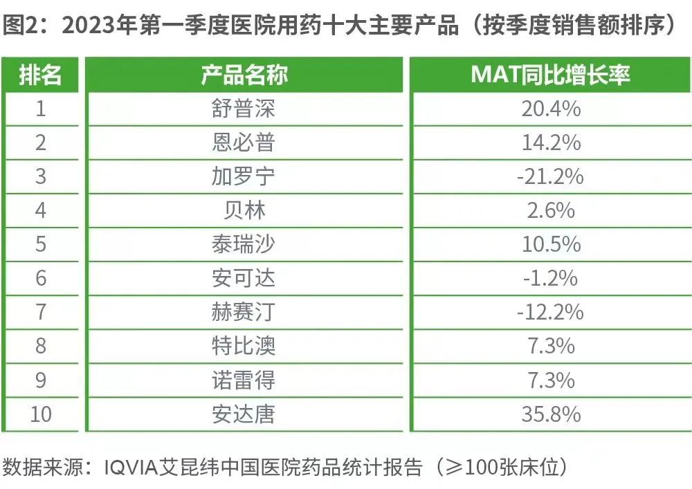 从产品的季度销售额来看,舒普深继续保持第一,恩必普和加罗宁仍分列第二、第三位。在排名前10的产品中,6款产品来自跨国企业。安达唐继续保持快速增长,MAT同比增长率达到35.8%。(图2)