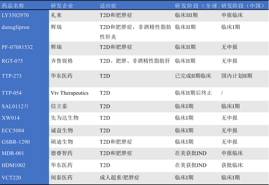 截至目前,全球尚无口服小分子GLP-1RA药物上市,近期礼来GLP-1R口服激动剂LY3502970启动III期,辉瑞也有两款口服激动剂danuglipron和PF-07081532在临床研究中,除此之外,国内也有很多药企布局口服GLP-1R激动剂,如齐鲁锐格的RGT-075、信立泰的SAL0112片、先为达生物的XW014、诚益生物的ECC5004和硕迪生物的GSBR-1290等(图4)。