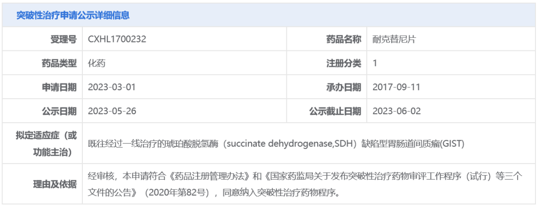 今日(5月26日),中国国家药监局药品审评中心(CDE)官网最新公示,由亚盛医药全资子公司顺健生物申请的耐克替尼片拟纳入突破性治疗品种,拟开发适应症为:既往经过一线治疗的琥珀酸脱氢酶(SDH)缺陷型胃肠道间质瘤(GIST)。公开资料显示,这是亚盛医药开发的新型第三代BCR-ABL酪氨酸激酶抑制剂(TKI)奥雷巴替尼(HQP1351),此前已在中国获批用于治疗慢性髓细胞白血病(CML)慢性期或加速期的成年患者。