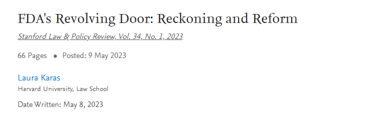 Karas, Laura, FDA's Revolving Door: Reckoning and Reform (May 8, 2023). Stanford Law & Policy Review, Vol. 34, No. 1, 2023, Available at SSRN: https://ssrn.com/abstract=4441764