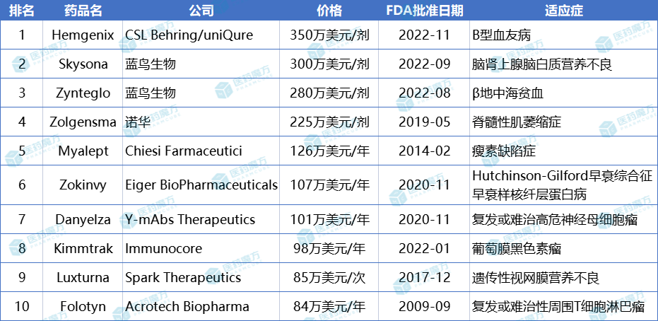 Hemgenix是由CSL Behring和uniQure开发的一款基于腺相关病毒5(AAV5)的基因疗法,2022年11月获FDA批准上市,用于使用凝血因子IX预防性治疗或有严重出血或自发性出血发作的B型血友病患者。该产品以每剂350万美元的价格位居榜首。