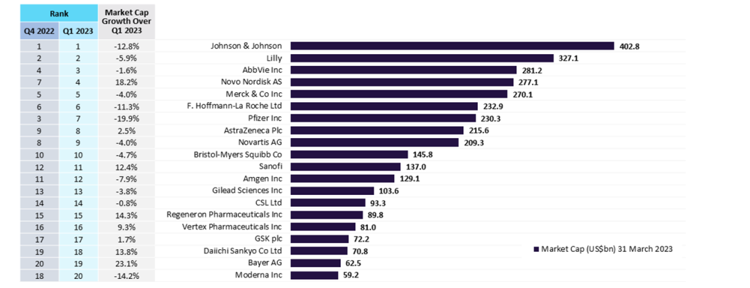 图1. 截至 2023 年 3 月 31 日,按市值计算的全球TOP 20 生物制药企业 图片来源:Global Data
