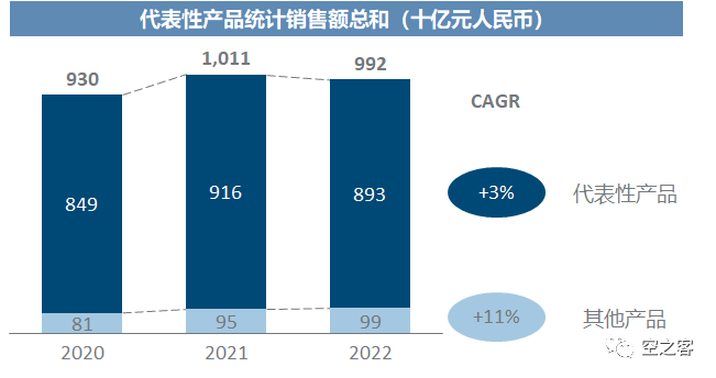 首先进行整理标记的927个代表性产品,共计销售额在9,000亿上下、占统计销售额总和的约90%,可以说是具备代表性的;而且三年以来的销售额总数基本不变,非常有利于我们观察这其中在不同产品之间的支付转移情况。