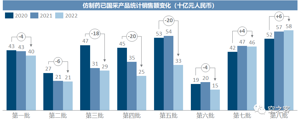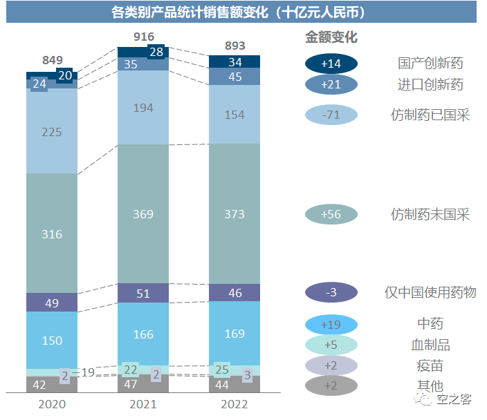 然后我们可以从下图非常鲜明地得出结论:仿制药集采是“腾笼”的绝对主力,三年来统计销售额共被挤压掉712亿(须作说明第7/8批集采品种因2022年销售影响不大而被归入未国采范围);而“换鸟”的受益者主要是国产和进口的创新药、尚未国采的仿制药、以及很多人不希望看到的中药。此外,重点监控品种也确实受到了挤压,统计销售额从2020年的961亿降到2022年的848亿。
