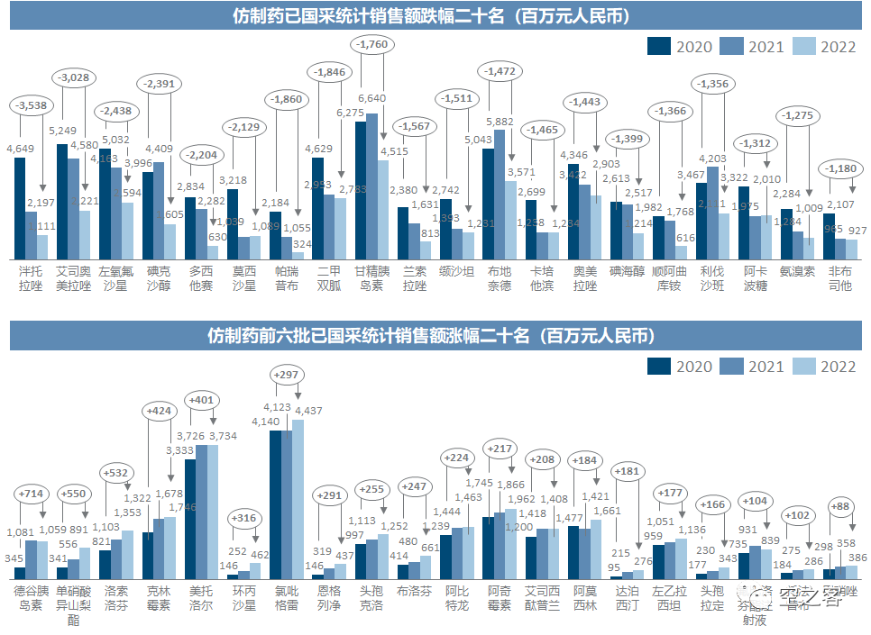 在已国采的仿制药中,第一和第二批因主要在2020年以前开始执行、故在近三年没有继续造成太大杀伤(即使在续约过程中也相对温和),重点释放支付能力的事第三到第五批、基本都下滑了40-45%,而第七和第八批因执行时间较短而影响未出现在2022年范围内、将作为2023年的主要杀伤范围。在已国采仿制药统计销售额的跌幅前二十名中大多是抗感染、代谢、心血管、肿瘤等大品种,而也不乏在集采情况下仍有一定增量的品种。