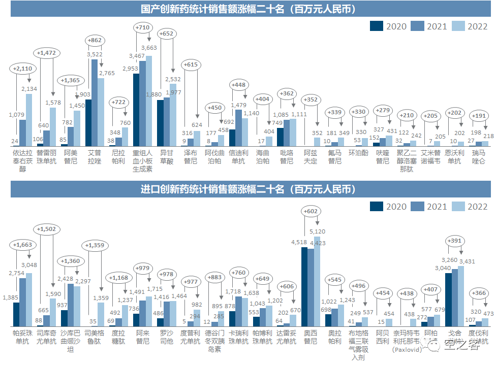 在创新药的增量中,我们对比国产和进口各前二十名,含金量的巨大差异肉眼可见,无论是绝对总量、还是相对增量,进口创新药仍然明显占据上风,也侧面印证了只要能带来明确的临床获益,即使在医保控费背景下依然能获得明确收益。须作说明的是,IMS对相当多数创新药都有显著低估,但作为横向对比仍统一使用此统计销售额口径、并不影响方向性结论。