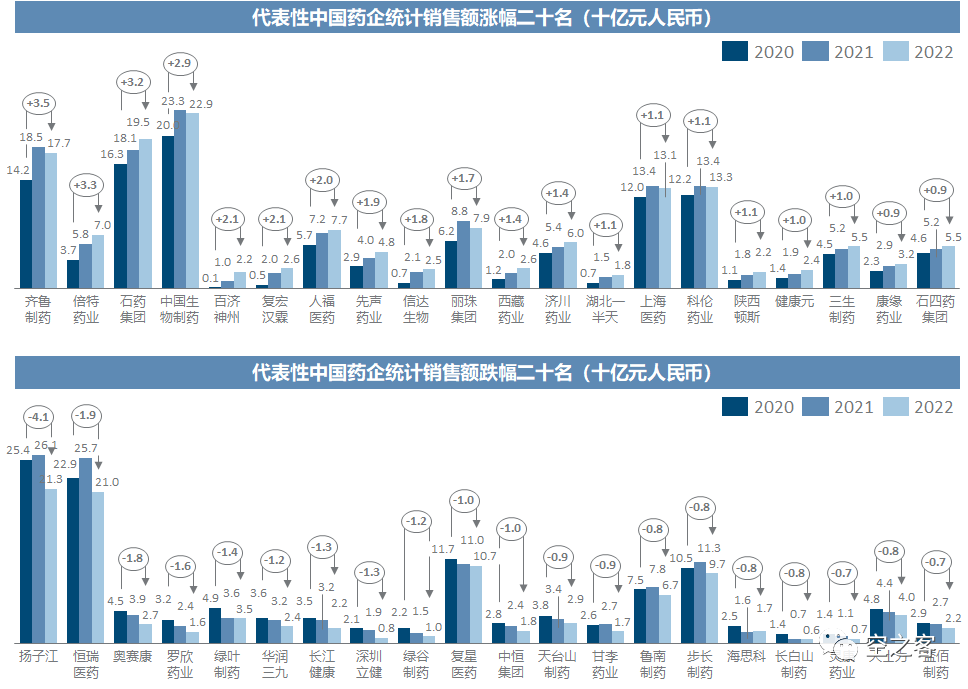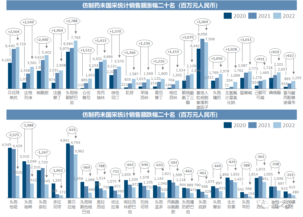 令人好奇的是仿制药未国采产品的巨大增量(统计销售额三年增加了563亿),从涨幅榜上可以看到,以贝伐单抗为代表的有明确临床价值的产品,在集采之前仍旧给头部企业带来巨大收益,这部分增量甚为可观、甚至大于创新药当前的体量;而进入跌幅榜的未国采仿制药基本都是重点监控品种名单的座上客,尤其是抗生素更是叠加着限抗令的影响。