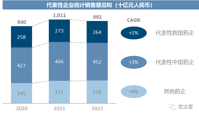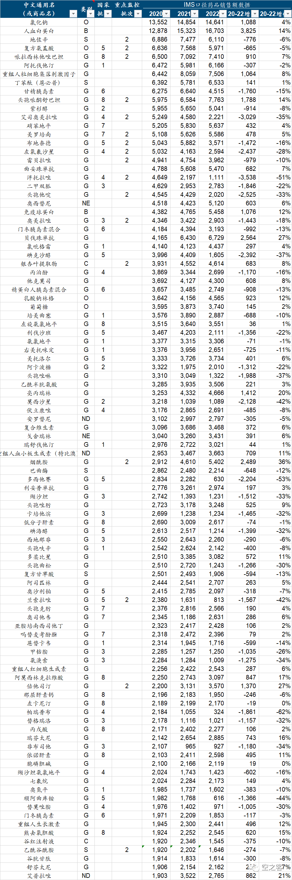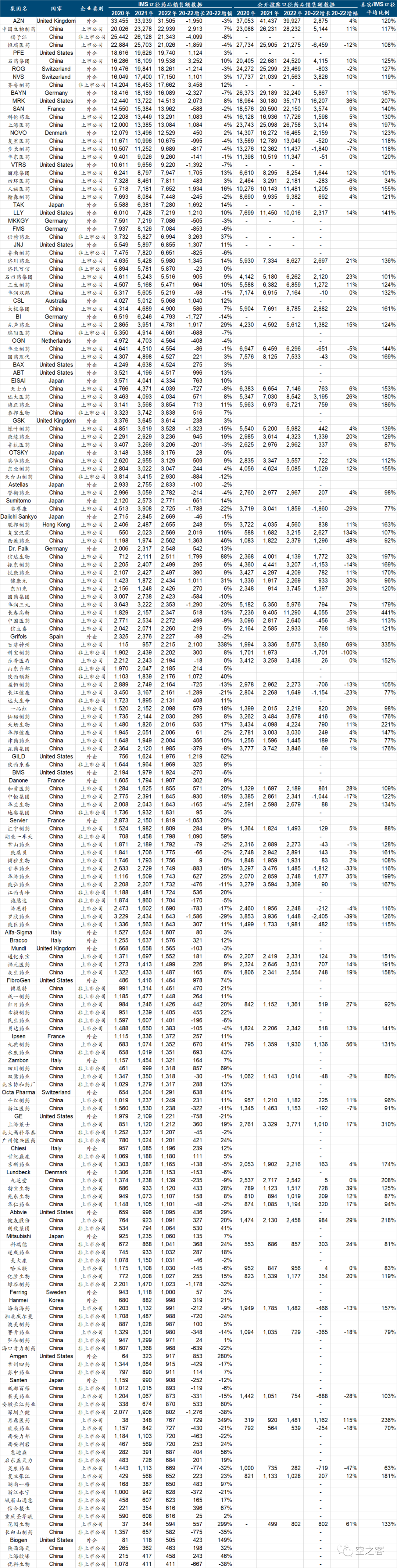 数据来源是IMS对2020/2021/2022三年在中国市场所有品种的销售额统计,共覆盖3,633家集团公司名称和2,878个药物名称,三年统计范围内销售额分别为9,297/10,106/9,920亿,基本符合整体医药总市场规模1.8万亿左右的数量级。