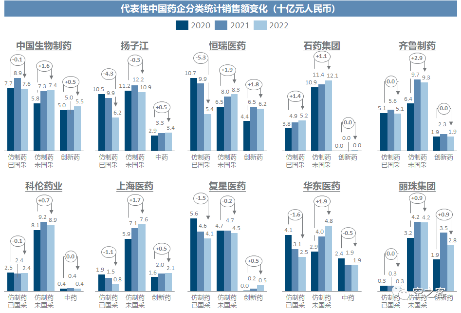 具体到这些企业的产品线格局变化,我们选取中国传统药企销售额较大的前十名(生物科技企业的商业化销售问题相对独立可参见【医苑观畴】不是所有卖药都叫商业化:2022年下半年中国Biotech商业化进展总览),须再次做出说明的是下图列出的统计销售额与公司报表收入金额有较大差异,原因一方面是统计口径与真实销售额的差异、另一方面是很多公司业务范围较大并不止药品销售(还可能有医药商业、原料药、医疗器械等)。我们可以看到,首先集采并非对所有药企都形成了致命打击,而且未集采仿制药仍在持续带来增量,部分传统药企的创新药产品线如果再能有一定贡献的话,完全有可能在过去几年实现增长,如天晴、石药、齐鲁等日子都过得不错;反过来像恒瑞这样集采坑过深实在填不平的、扬子江这样几乎完全没有创新增量的、复星这样各方面相对平庸的,业绩压力相对就大很多了。