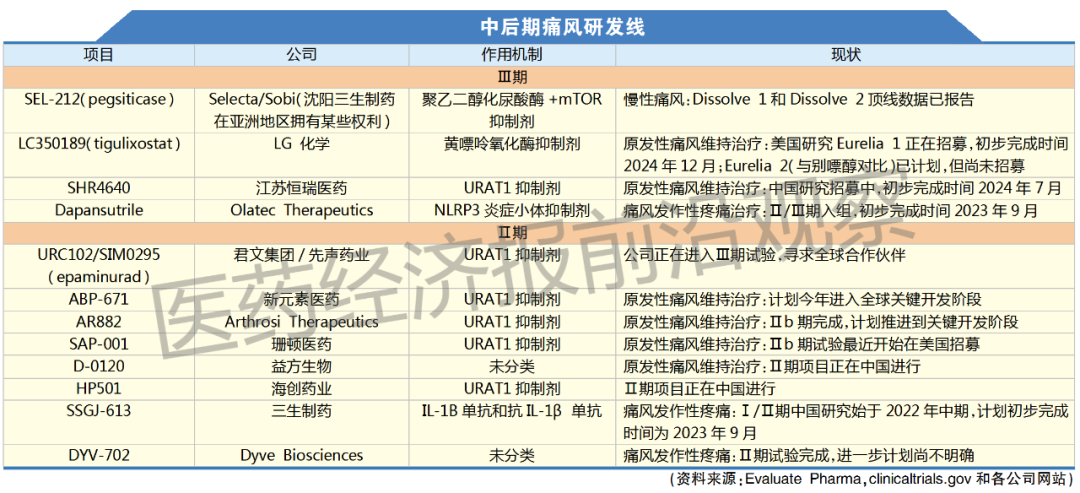 还有一些开发商正在寻求解决痛风发作相关的疼痛。诺华开发的 Ilaris在欧洲获得了批准,不过,FDA长期以来一直拒绝批准这种白细胞介素治疗痛风的方法,诺华和再生元相关产品为此都遭到了拒绝。