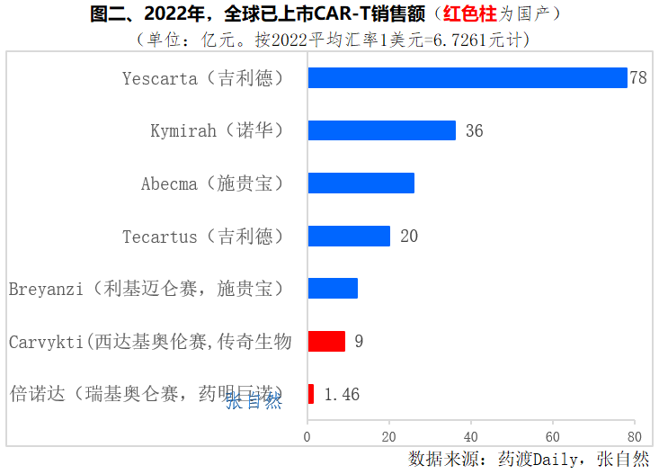 其中,销售额最大的是吉利德的Yescarta和诺华的Kymirah,分别卖了78亿元和36亿元,二者都是全球最早于2017年上市的,已销售了6年,比我国的早上市了4~5年。
