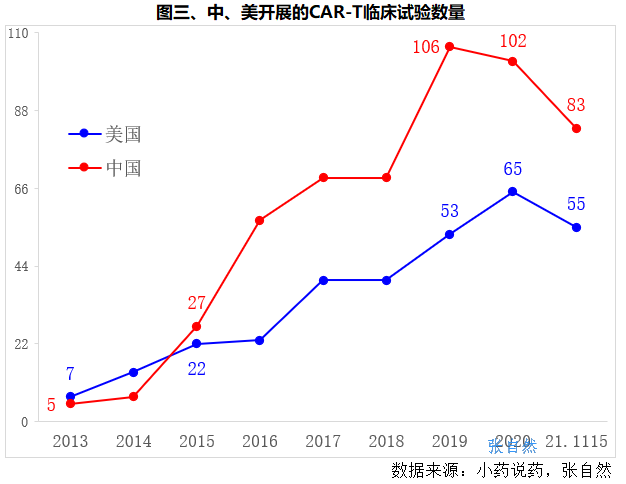 从2015年开始,我国CAR-T临床试验数量就已超过美国,2019年,我国的CAR-T临床试验数量(106款)已2倍于美国(53款)。(详见图三)