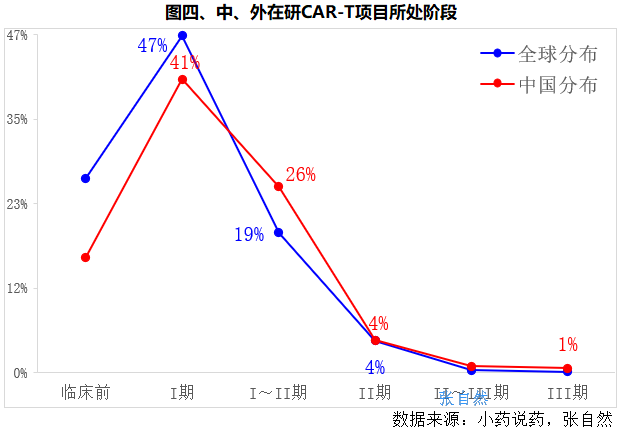 目前,我国和全球在研的CAR-T项目,约有70%都仍处于早期研发阶段(I期、I~II期)。(详见图四)