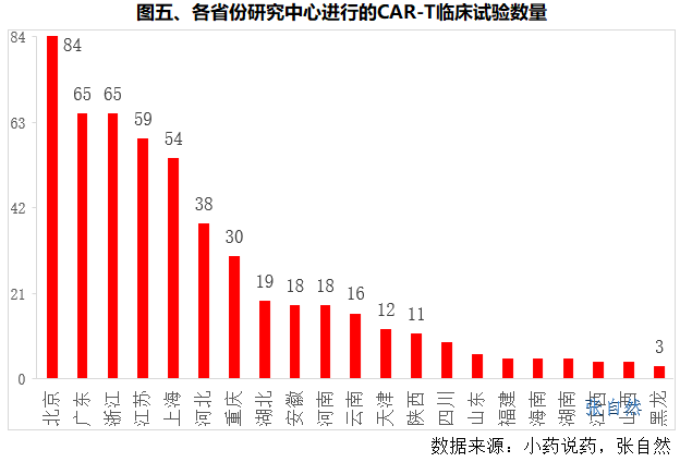 其中,北京承接的CAR-T研究项目最多,达84项。广东和浙江并列第二,都有65项。