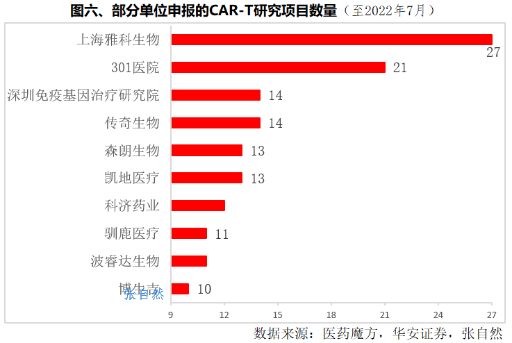 截止2022年7月,申报CAR-T研究项目最多的是上海雅科生物,申报了27项。