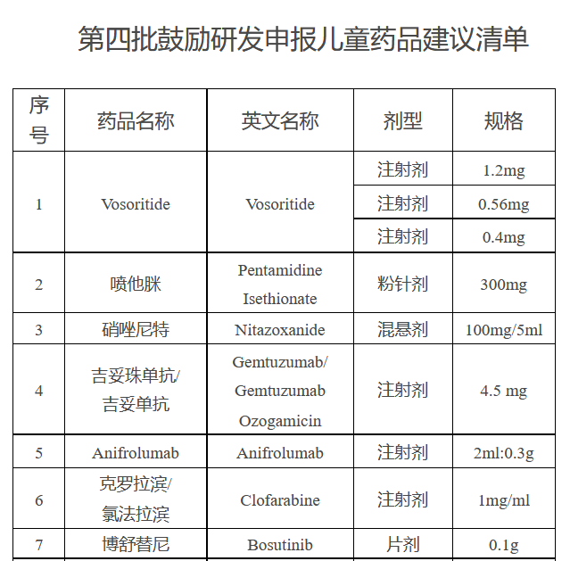 近日,国家卫健委药物政策与基本药物制度司发布《关于第四批鼓励研发申报儿童药品建议清单的公示》,包括Vosoritide、喷他脒、硝唑尼特、吉妥珠单抗/吉妥单抗在内的29个儿童药品进入申报清单。
