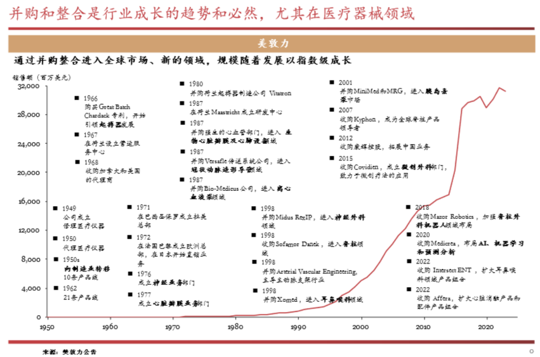 以全球医疗行业前十大医疗器械领域为例,国内已经出现了一批逐渐构筑了深厚护城河,具备国际竞争力的企业,但即便是国内器械“一哥”,迈瑞医疗的千亿市值也可以说仍在路上。放眼海外,如美敦力成立之初仅仅为一家医疗仪器修理公司,却不断通过创新研发加之并购的方式拓展产业边界,如今,美敦力已经蜕变成为一家千亿美金市值的医疗器械领域航空母舰,作为全球医疗科技、服务和解决方案的领导者,其业务已遍布全球150多个国家和地区,拓展至70余种疾病领域,覆盖心血管、外科业务、神经科学与糖尿病等领域。
