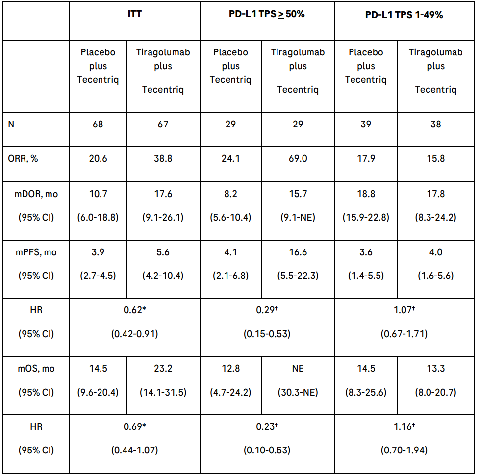 结果显示,相较于对照组,tiragolumab所在治疗组ORR高了1.88倍(38.8% vs 20.6%),mPFS高了1.44倍(5.6个月 vs 3.9个月),mOS高1.6倍(23.2个月 vs 14.5个月)。