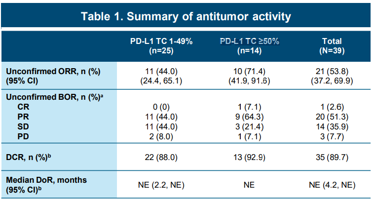 39名患者经过28.1周随访后,总人群ORR达53.8%,PD-L1 TC ≥50%的高表达人群,ORR达到了惊人的71.4%。