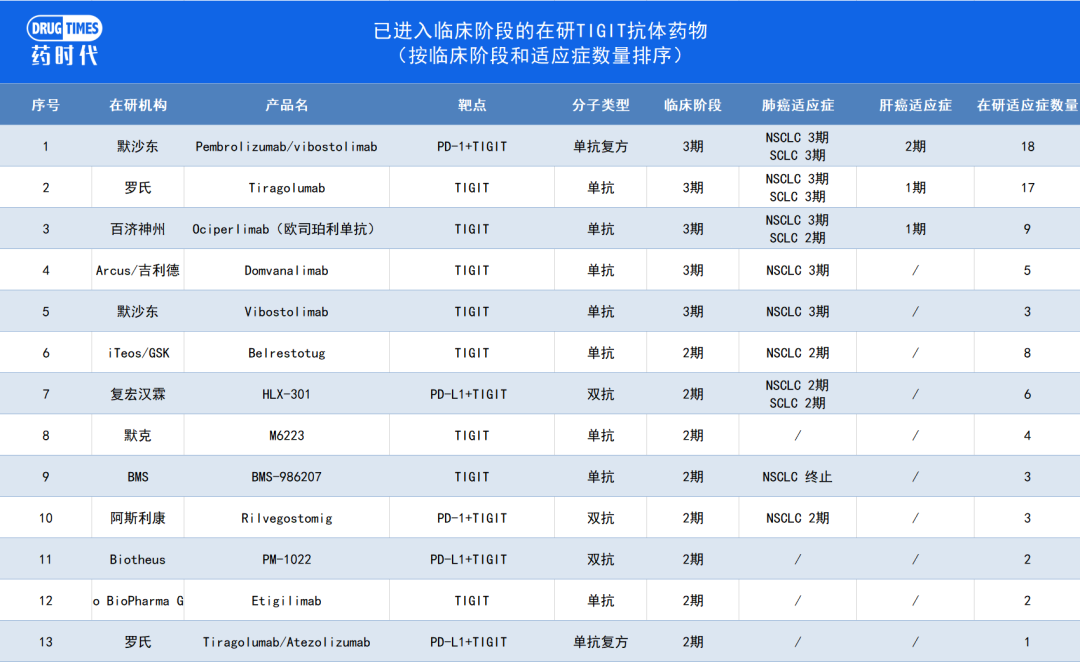 这13个试验里,适应症包含了NSCLC、SCLC、肝癌、胃癌、卵巢癌、黑色素瘤;治疗方法包含了TIGIT单用、TIGIT+PD-1、TIGIT+PD-L1、TIGIT+PD-L1+VEGF、TIGIT+PD-1+第三种免疫疗法。
