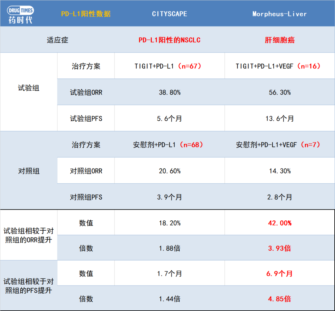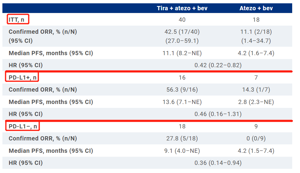 可以看到,在肝癌试验里TIGIT组相较于对照组的ORR、PFS提升都要远大于NSCLC试验。而且NSCLC试验的人群全部都是PD-L1阳性的患者,肝癌试验里还混入了一部分PD-L1呈阴性的患者。