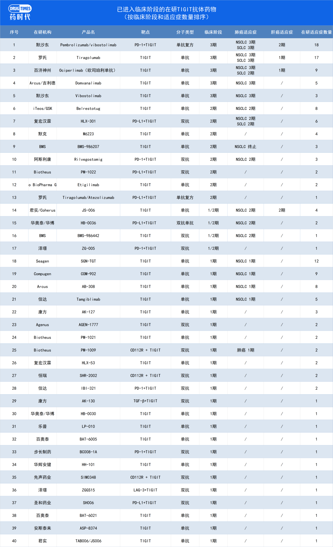 根据智慧芽数据库,全球在研TIGIT产品高达94款,有43款药物进入了临床阶段,其中有41款抗体药物,包括24款单抗、15款双抗、2款单抗复方制剂。