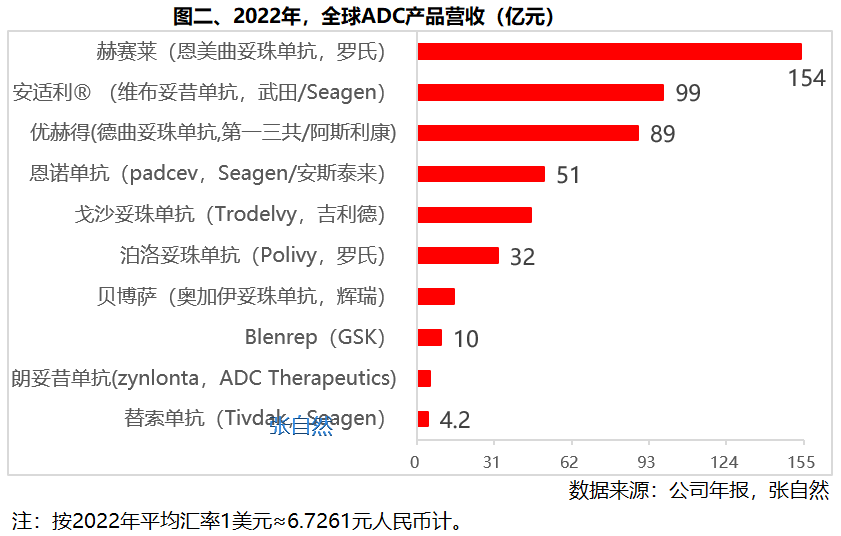 2022年,营收最高的是罗氏的赫赛莱(恩美曲妥珠单抗),实现销售22.88亿美元,折合人民币154亿元,也是唯一年营收过百亿的ADC。