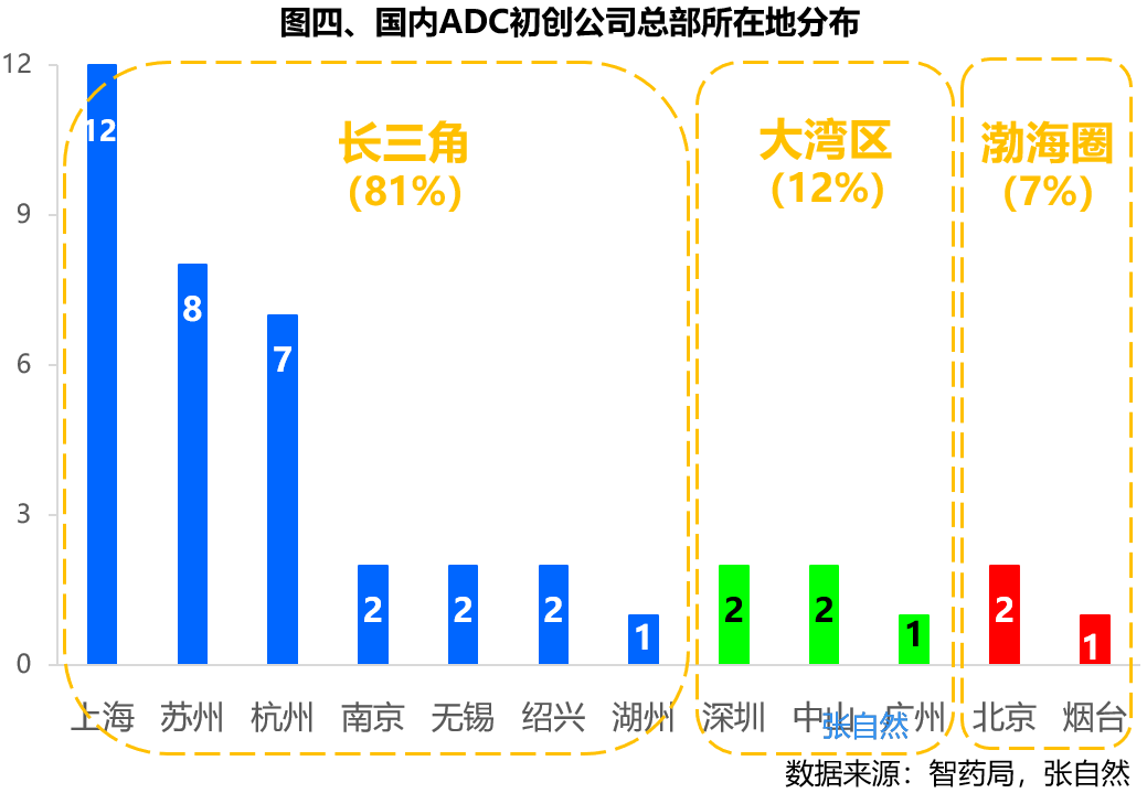 截止今年4月,全国已有ADC药物初创公司42家,其总部都位于沿海经济发达城市,无一例外,共涵盖了6个省份、12个城市,且长江三角洲就有34家,占比高达81%。其中,上海、江苏、浙江分别占了12家、12家和10家,三省份相当均衡。就单一城市来看,上海12家、苏州8家、杭州7家。如上海的以臻格生物、有临医药,苏州的启德医药、普方生物、宜联生物,以及杭州的多禧生物、百力司康等。