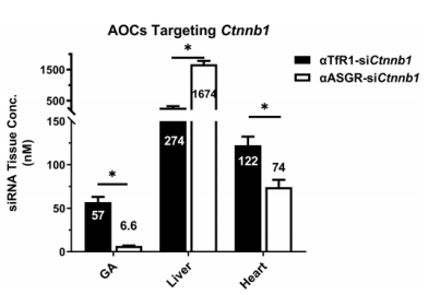 在小鼠实验中,研究人员将靶向cateninβ1(Ctnnβ1) mRNA的siRNA(称为:siCtnnβ1)偶联到抗ASGR或TfR1的抗体上,分别用于肝脏或骨骼肌的siRNA递送。