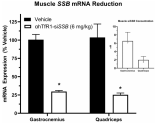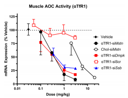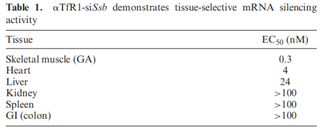 为进一步证明靶向TfR1的AOC的在肌肉中的特异性,研究人员设计了靶向Ssb mRNA(小RNA结合核酸外切酶保护因子)的siRNA(Ssb mRNA在各种组织中普遍表达)。结果表明,在腓肠肌中对降低Ssb mRNA的半数有效量为0.45nM。相比之下,在心脏中的效力低10倍,在肝脏中的效力低100倍。在其他组织(包括肾脏、脾脏和胃肠道)活性极低或无活性。