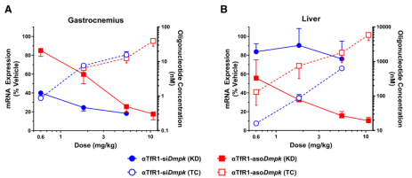 将一个靶向DMPK mRNA(肌强直营养不良蛋白激酶)的ASO偶联至TfR1抗体(TfR1-asoDMPK),腓肠肌中DMPK mRNA减少75%。而未偶联的裸ASO需要增加25倍的剂量才能达到一样的活性,这进一步证实了受体介导递送的具有良好的药理活性。