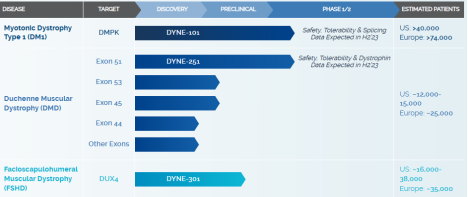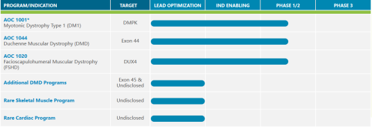 Avidity在研管线中有三款药物披露了具体的适应症,包括1型强直性肌营养不良症(DM1),面肩肱肌营养不良症(FSHD),杜氏肌营养不良症(DMD),目前都处于临床1/2期阶段。此前由于严重不良事件报告,FDA对AOC-1001项目进行部分临床搁置,直到今年4月Avidity展示了该项目的积极数据,证明了多种临床结局指标、疾病改变以及良好的安全性和耐受性。在5月17日,FDA放宽了临床搁置,允许增加给药剂量和更多的受试者招募。