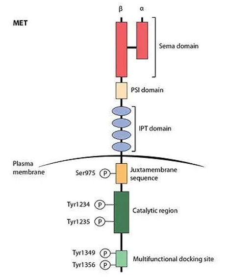 c-Met的细胞外部分包括三个结构域,一个N端SEMA结构域、一个富半胱氨酸结构域和四个IPT结构域。细胞内部分包括酪氨酸激酶催化结构域、膜旁结构域和羧基末端序列。