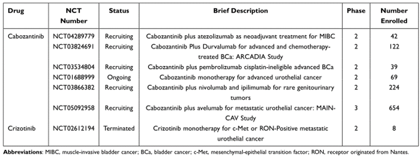 此外,一项cabozantinib和durvalumab联合治疗铂基化疗后转移性疾病的II期临床试验初步显示,联合治疗是安全的,达到了43.8%的客观缓解率。另一种包括c-Met在内的多靶点TKI,名为克唑替尼,同样具有临床应用前景。一项临床前异种移植研究表明,克唑替尼和cabozantinib均能显著抑制HGF/c-Met诱导的多种Bca肿瘤细胞系增殖和侵袭。目前,cabozantinib和crizotinib治疗BCa的多项临床试验正在进行中(图6)。