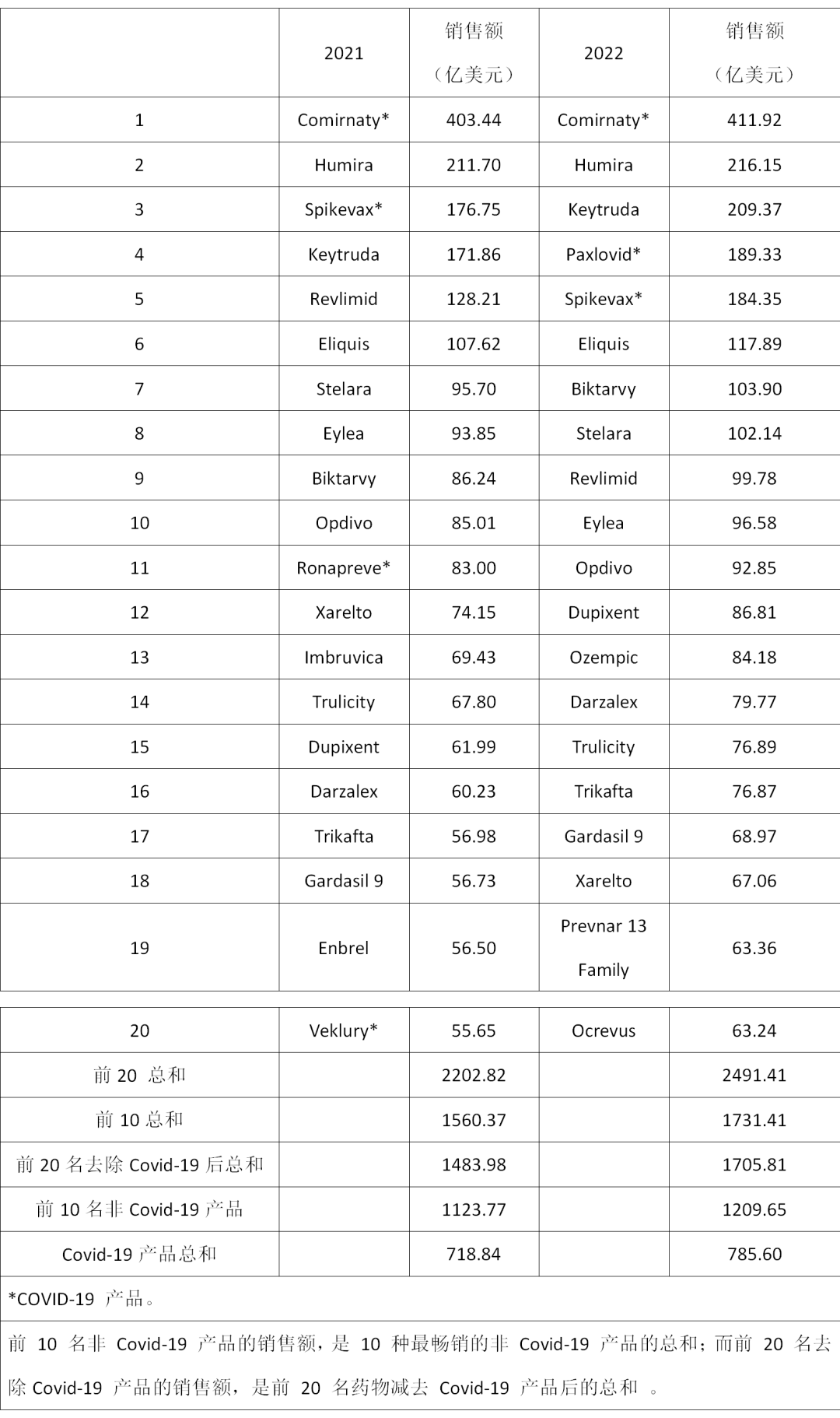 2021 年和 2022 年最畅销的药物图1显示了除 Covid-19 产品外的前 10 种最畅销药物。图2则给出了最畅销的Covid-19 疫苗和疗法。