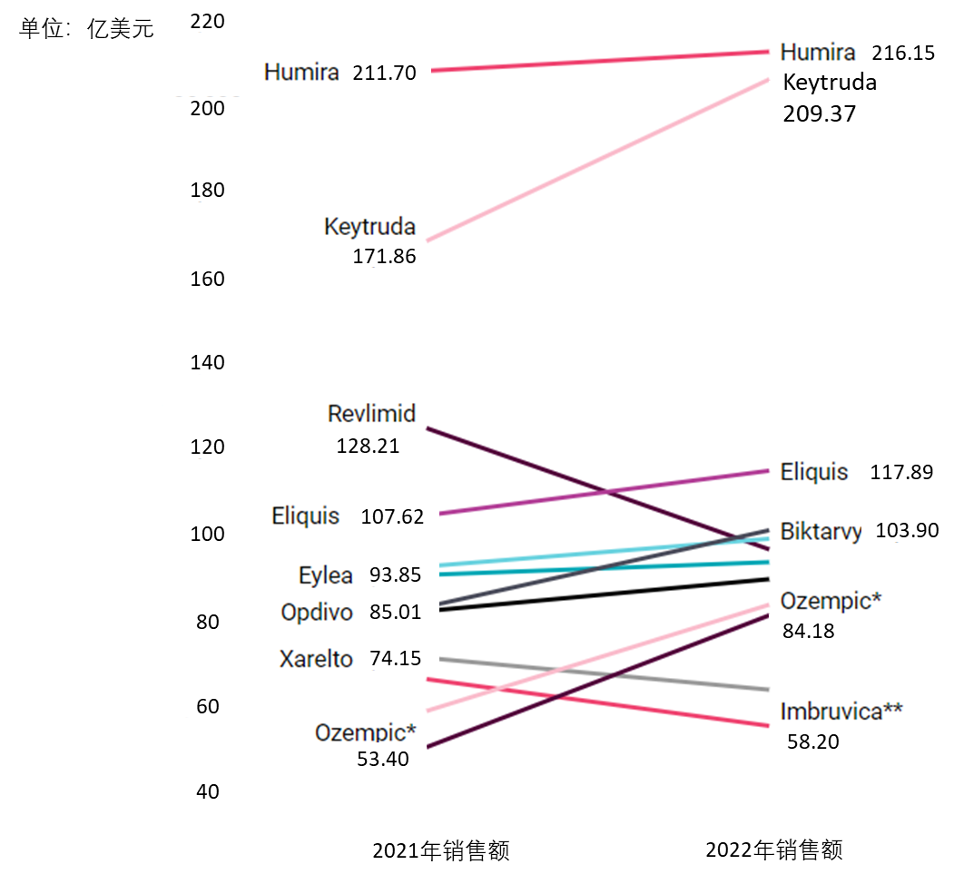 *2022 年新进入非 COVID-19 产品前 10 名行列,**2022 年退出前 10 大非 COVID-19 产品行列。资料来源:Biomedtracker、Scrip、公司报告的数据