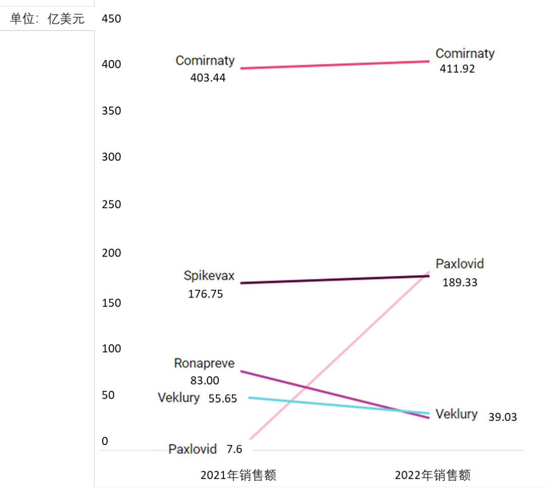 相对于Covid-19 疫苗 Comirnaty(辉瑞公司/BioNTech SE)和Spikevax(Moderna, Inc.)已经上市并攫取580亿美元的2021 年,2022年排名前 20 位的药物的销售额从 2200 亿美元跳跃到了将近2500亿美元,增幅高达13.1%。2022 年创纪录地实现了八种产品销售额迈过 100 亿美元大关的壮举,其中三种用于 Covid-19,而2021年实现这一成绩的只有6种产品。