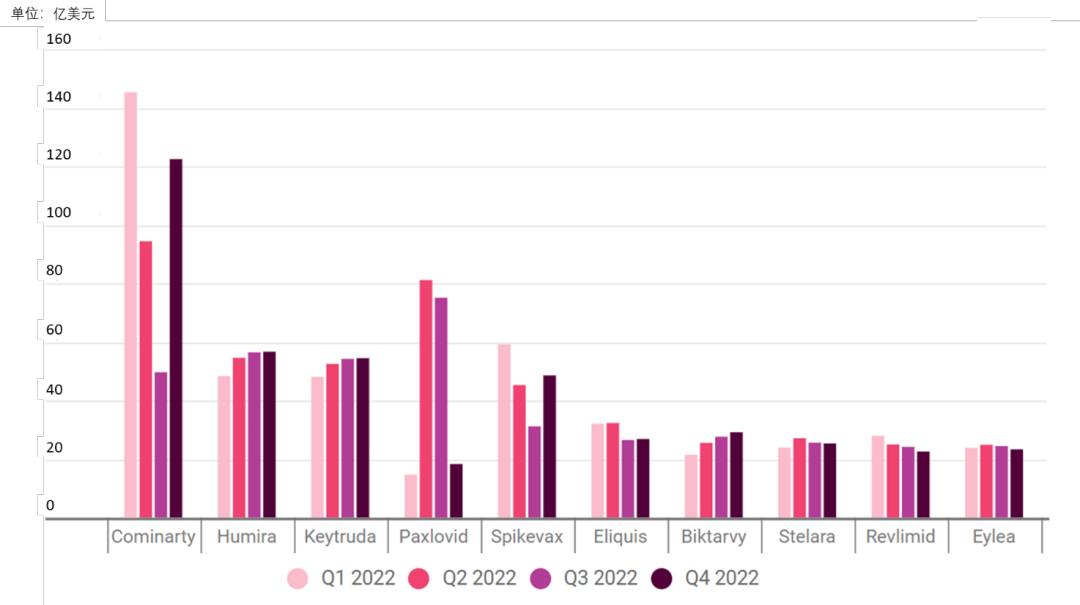 在Top 10 榜单中,唯一没有实现同比增长的药物是Bristol Myers Squibb的血癌药物 Revlimid(lenalidomide),该药物从第一季度开始就面临着美国和欧盟的仿制药竞争。唯一跌出前 10 名的产品是 BMS 的抗癌检查点抑制剂 Opdivo (nivolumab),它从2021年的第10名下滑到2022年底11位。尽管如此,该产品在 2022 年仍增长了 9.2%,达到 93 亿美元的销售额,并且在剥离 COVID-19 产品后仍位列前 10 名产品之列。取代Opdivo前10名位置的是辉瑞的 COVID-19 药 Paxlovid,后者在 2021 年 12 月下旬推出后,从无名之辈迅速蹿升到 2022 年的第4名。2022年排行榜前10药物的季度销售情况见图3。